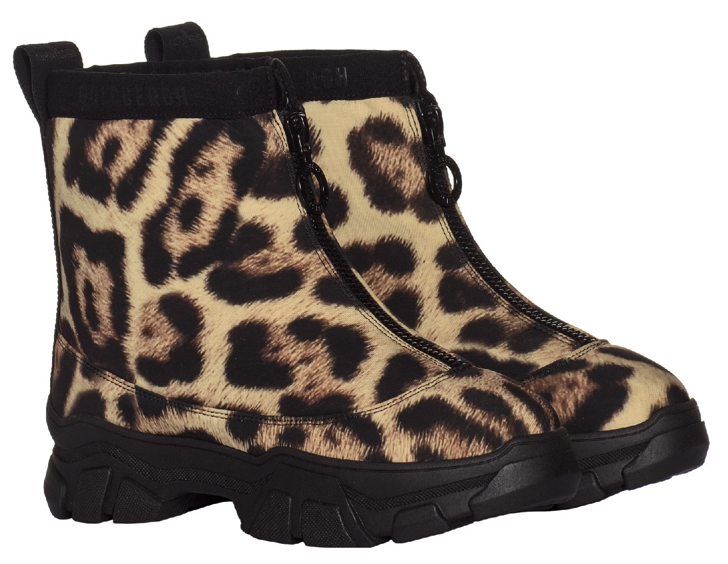 Deze chique snowboots komen uit de serie Stark van het merk Goldbergh. Deze snowboots met luipaardprint laten u er stijlvol uit zien in de sneeuw. De boots hebben een stevige rubberen zool met een waterdicht binnenwerk. Zo houden ze uw voeten droog en kunt u goed door de sneeuw lopen. De schoenen zijn gemakkelijk aan en uit te doen door de glanzende zwarte rits aan de voorkant, met een rond Goldbergh trekker. Op de band aan de achterkant en op de elastische band bovenaan kunt u ook het kenmerkende Goldbergh logo vinden. De snowboot valt kleiner uit, we raden daarom aan om een maat groter te bestellen.