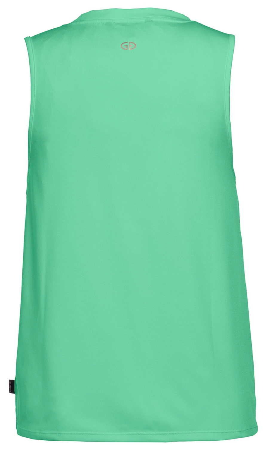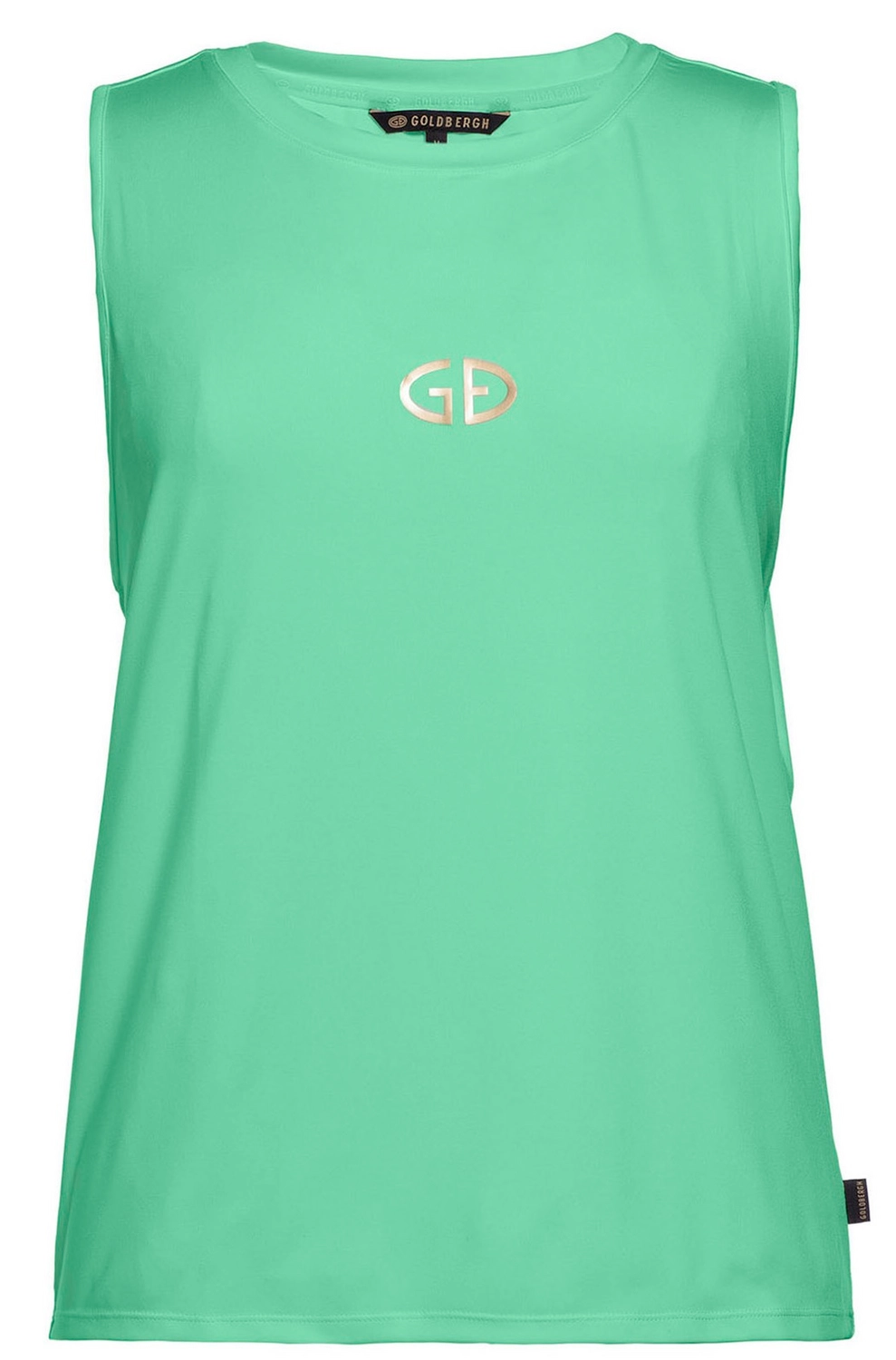 Deze tanktop is afkomstig uit de Gigi serie van het merk Goldbergh. De top is vervaardigd uit 90% gerecycled polyester en 10% elastaan, wat zorgt voor een vochtregulerende en sneldrogende stof die vervelende geurtjes voorkomt. De lichtgewicht top is mouwloos en heeft een loose fit. U kunt deze Gigi tanktop herkennen aan het GB logo op de borst en het geweven merklabel aan de zijkant.